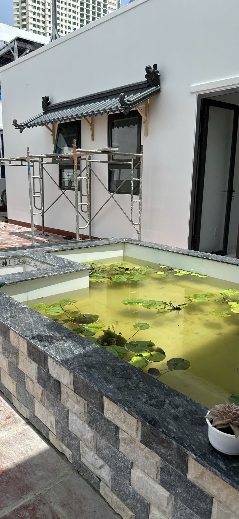 Bên dưới là hồ sen xanh mát, gợi cảm giác yên bình và cân bằng phong thủy, giúp không gian sống thêm thư thái, dễ chịu.